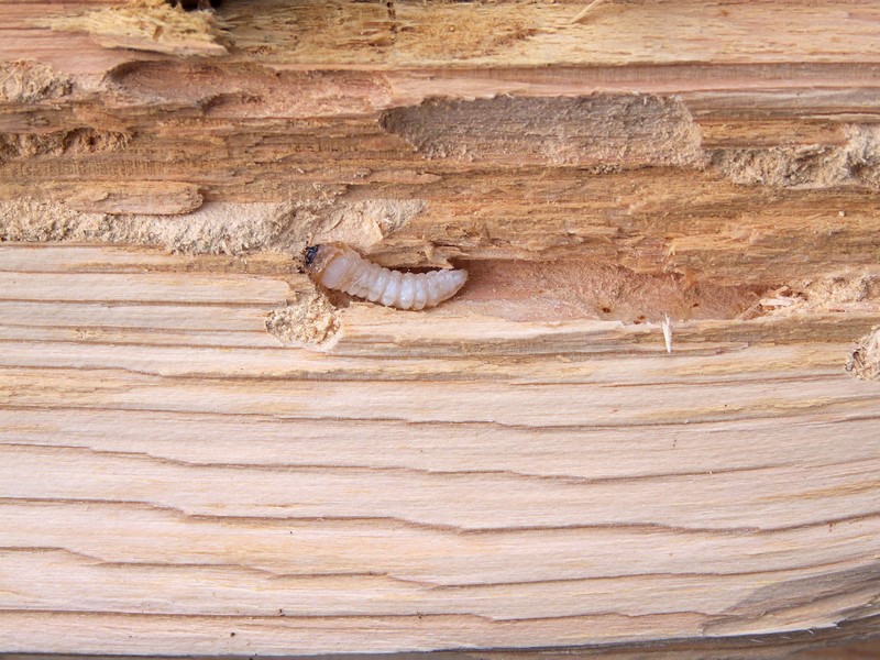 • Larvas - si el túnel es muy superficial y se colapsa la capa externa de la madera se puede ver a las larvas en el interior.